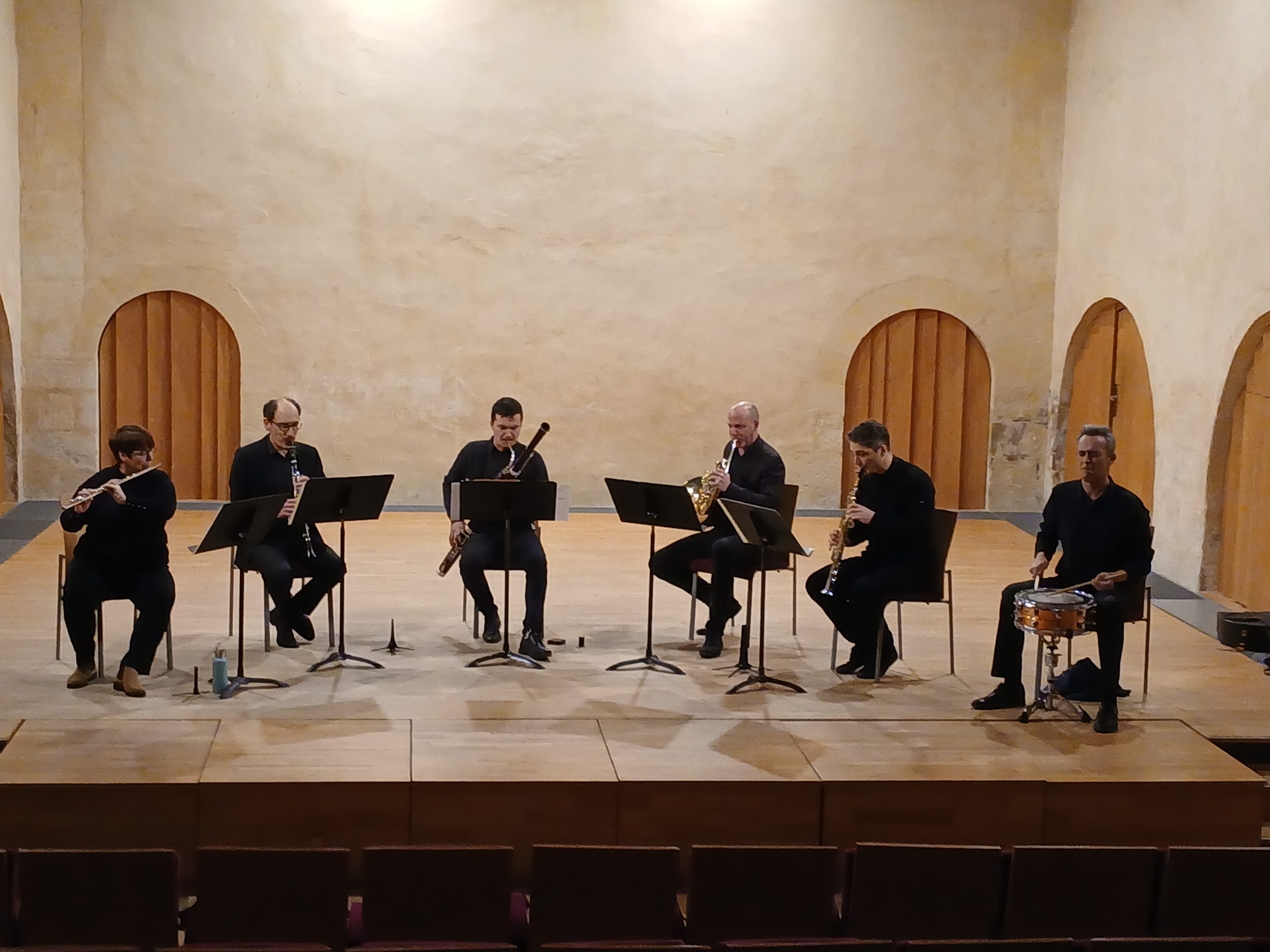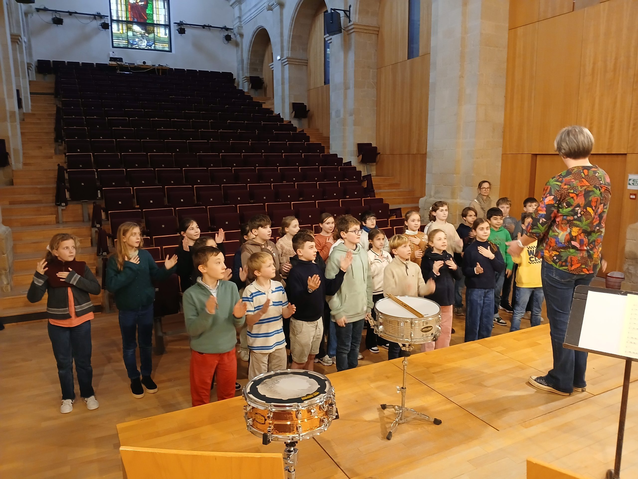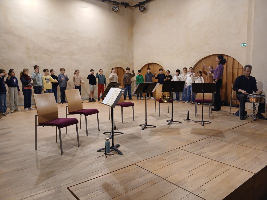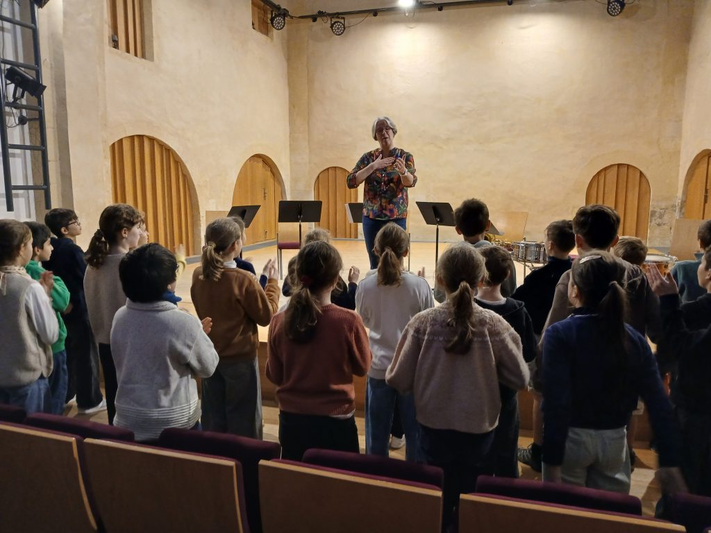 Le lundi 9, malgré une pluie continue, les élèves de CM2 sont allés au conservatoire pour écouter le Boléro de Ravel. Quelques exercices de rythme et de musicalité (nous avons peut-être parmi nous de futurs chefs d’orchestre ! ) et les élèves se sont installés pour écouter l’oeuvre. La séance s’est terminée par un échange avec les musiciens qui ont chacun leur tour présenté leur instrument.