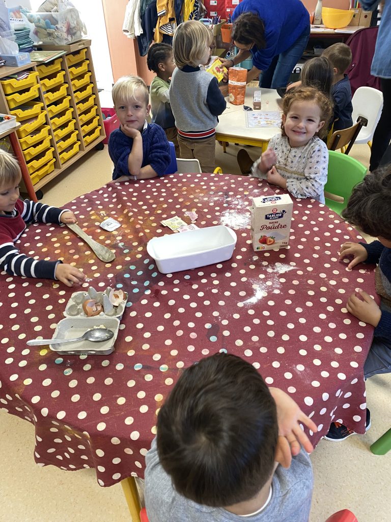 Après la sortie au verger, nous avions beaucoup de pommes alors nous avons fait de délicieux gâteaux que nous avons partagés avec tous les enfants de maternelle.