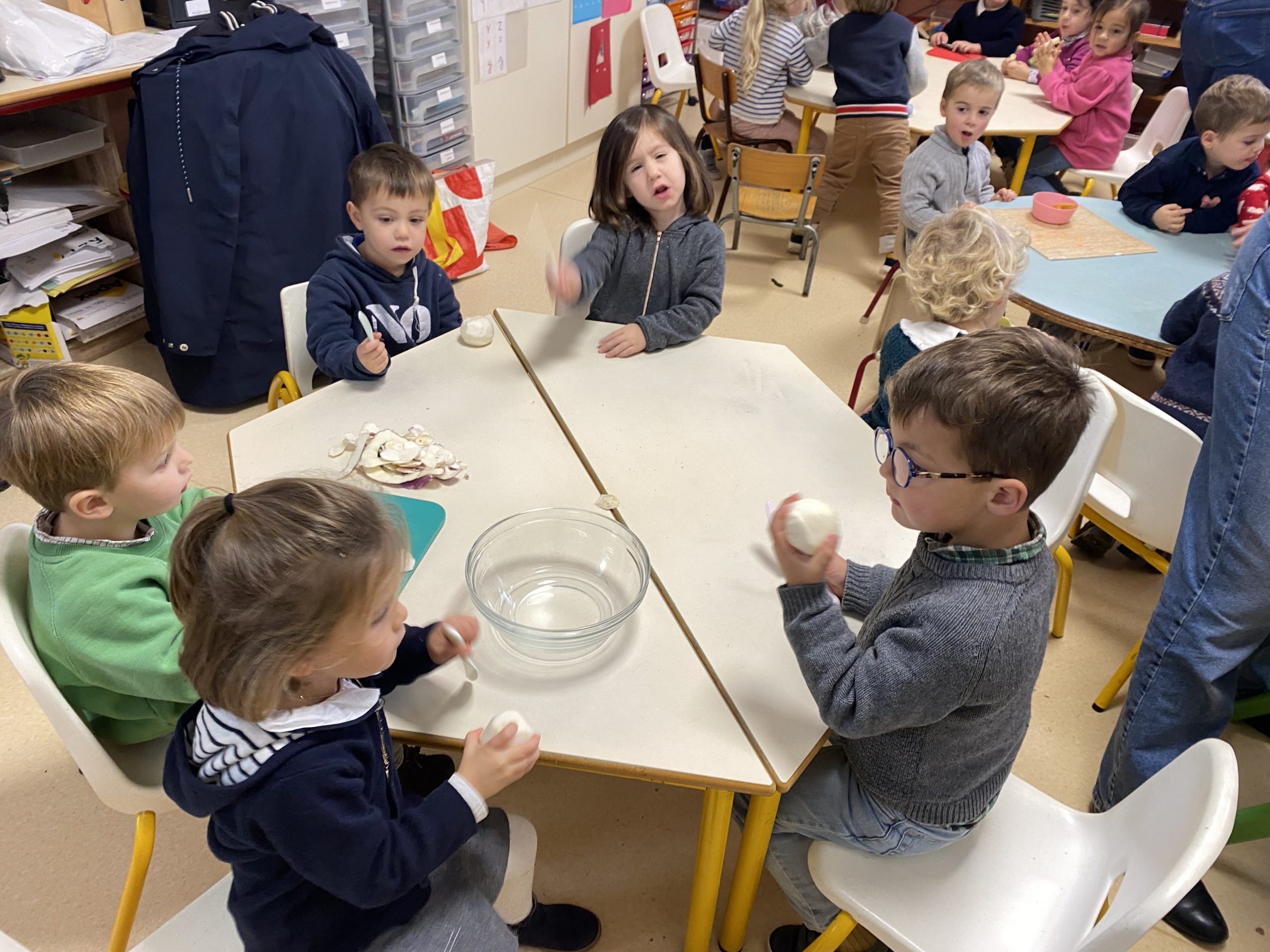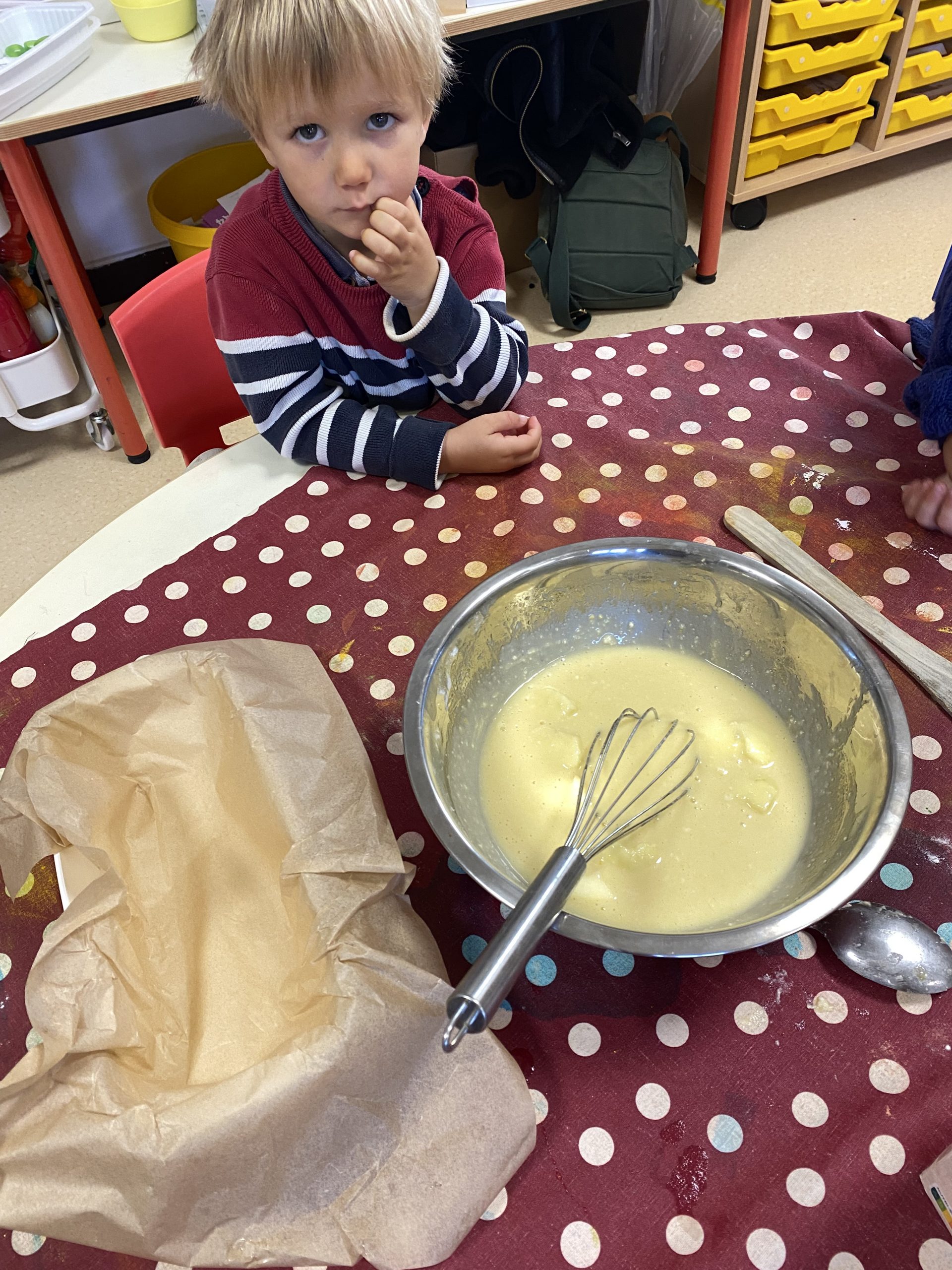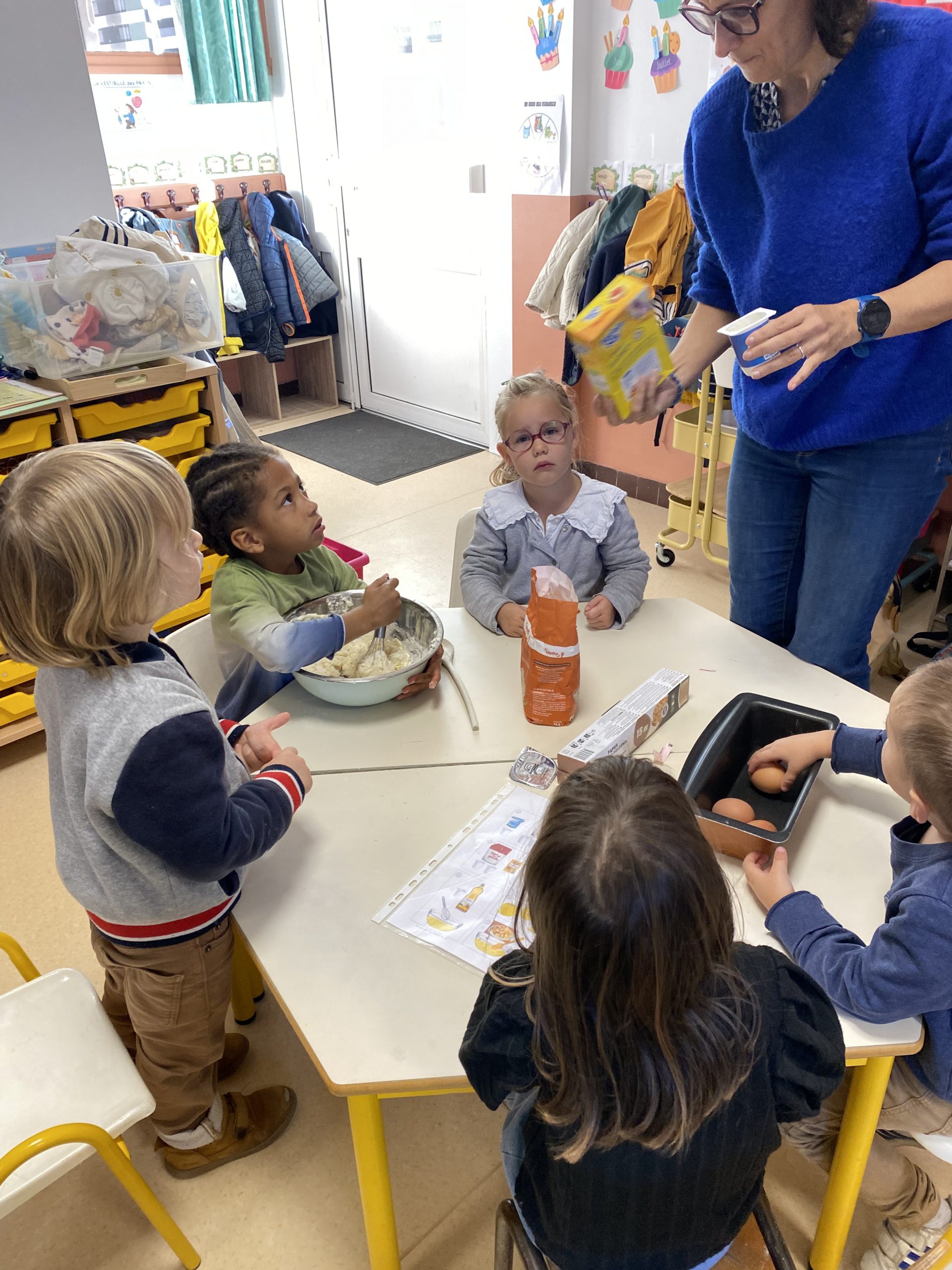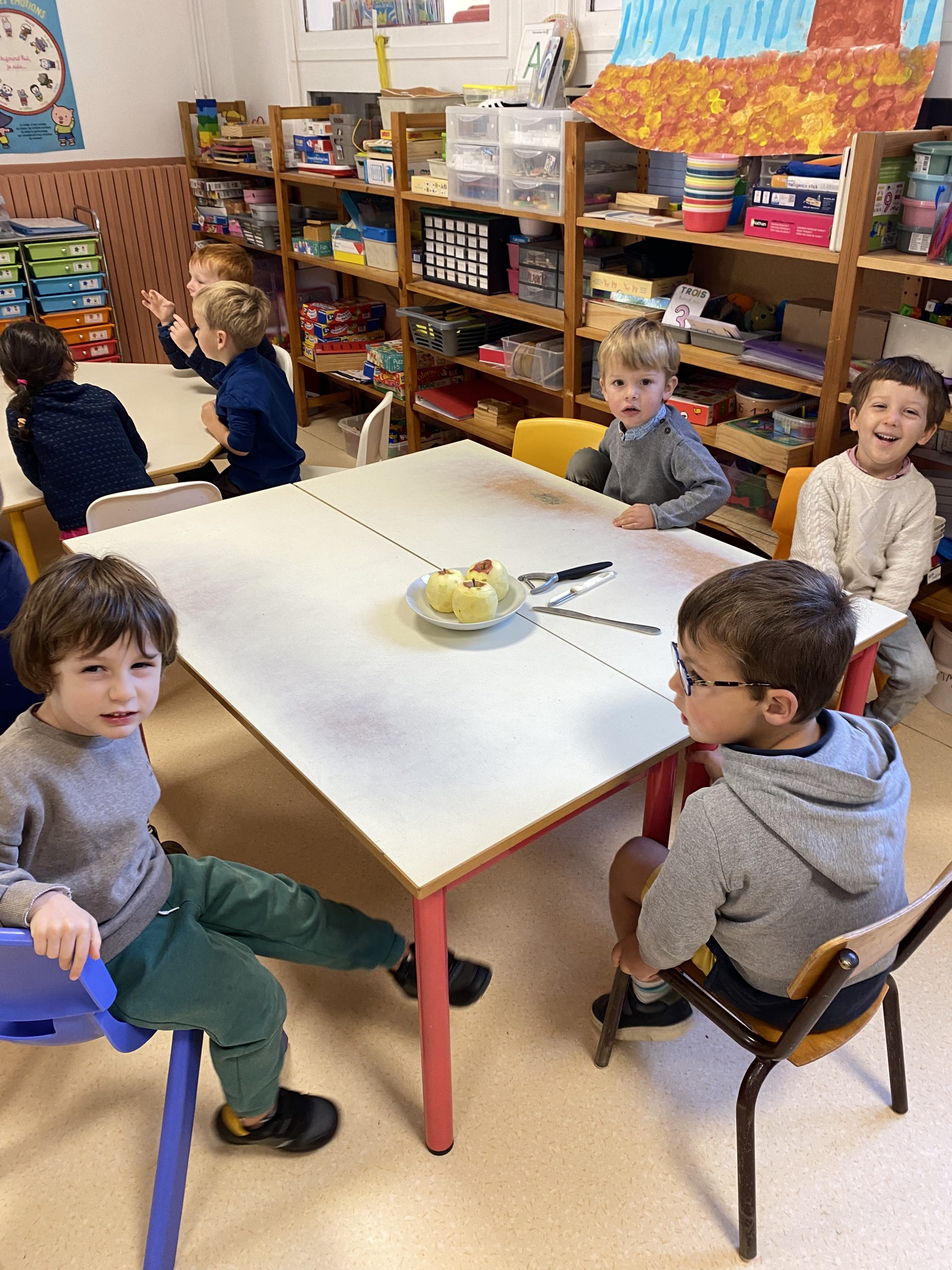 Après la sortie au verger, nous avions beaucoup de pommes alors nous avons fait de délicieux gâteaux que nous avons partagés avec tous les enfants de maternelle.